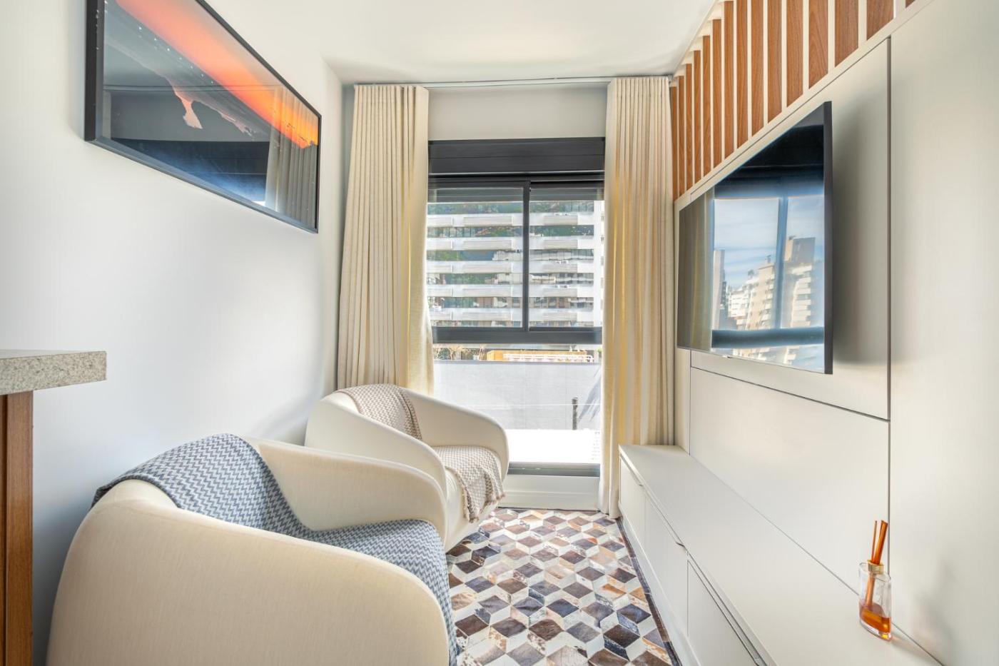 Estúdio. The air-conditioned apartment has 1 bedroom, 1 bathroom and a kitchen. The fully equipped kitchen features a stovetop, a refrigerator, an oven and a microwave. This apartment features a washing machine and a TV. The unit has 3 beds.